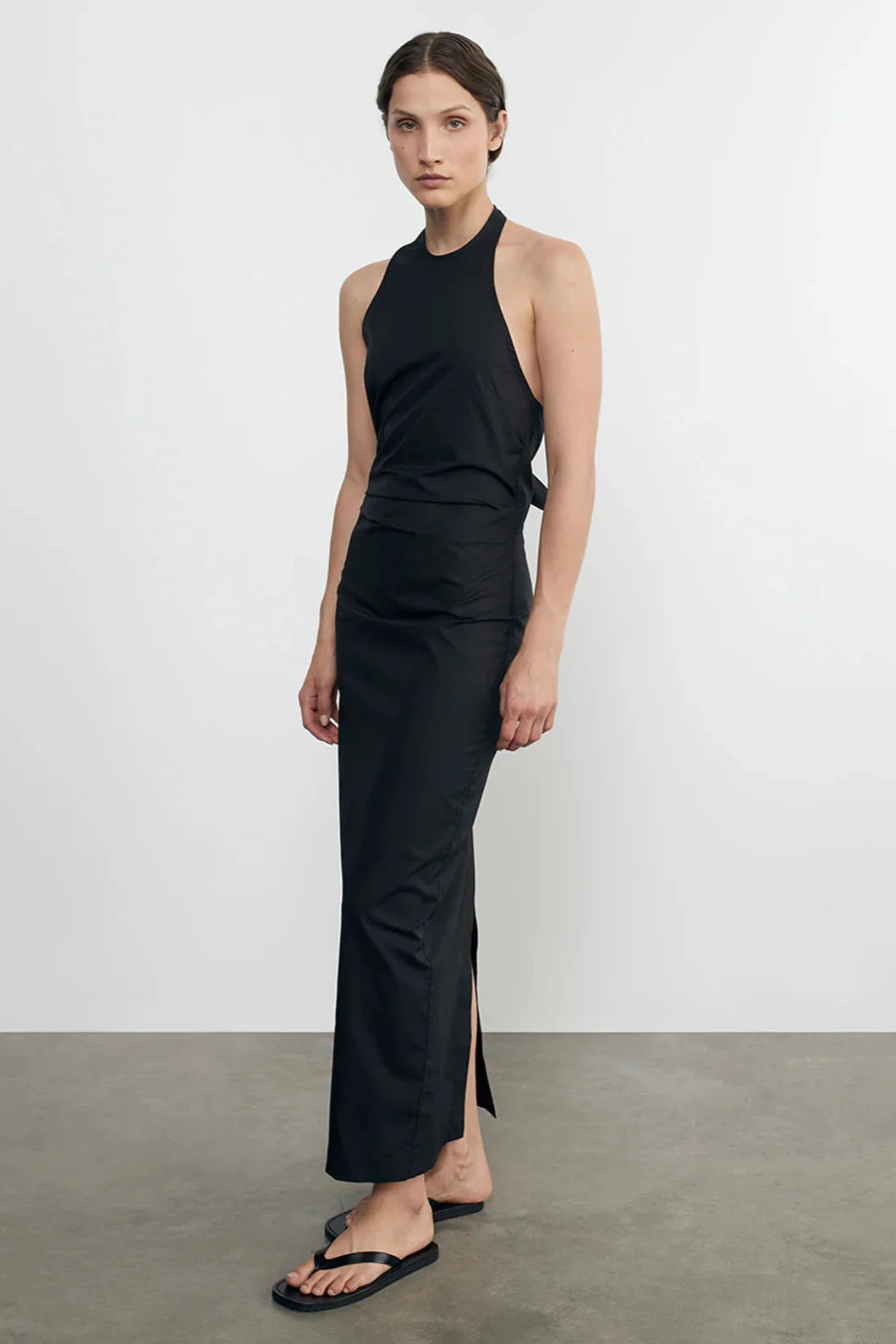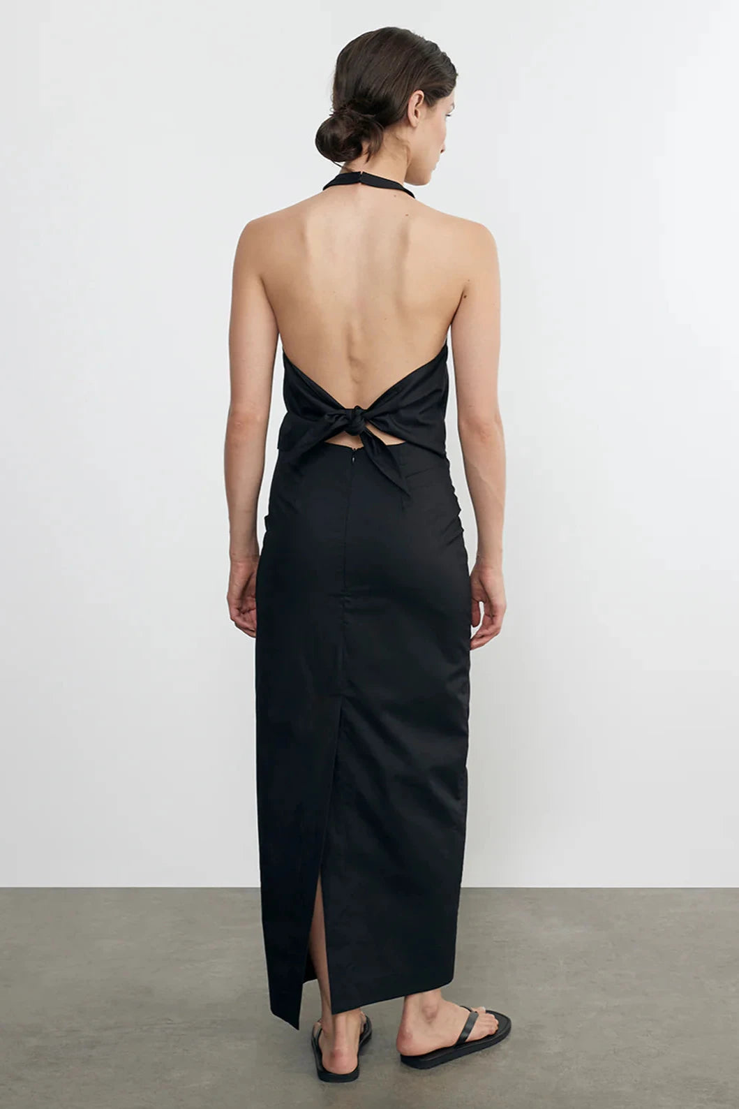 Lightweight and breathable, this dress is made from 100% cotton poplin, giving it a structured and smooth. Featuring a halter neckline with a tie-back detail for an adjustable fit and an ankle-skimming length, this dress is effortlessly elegant.