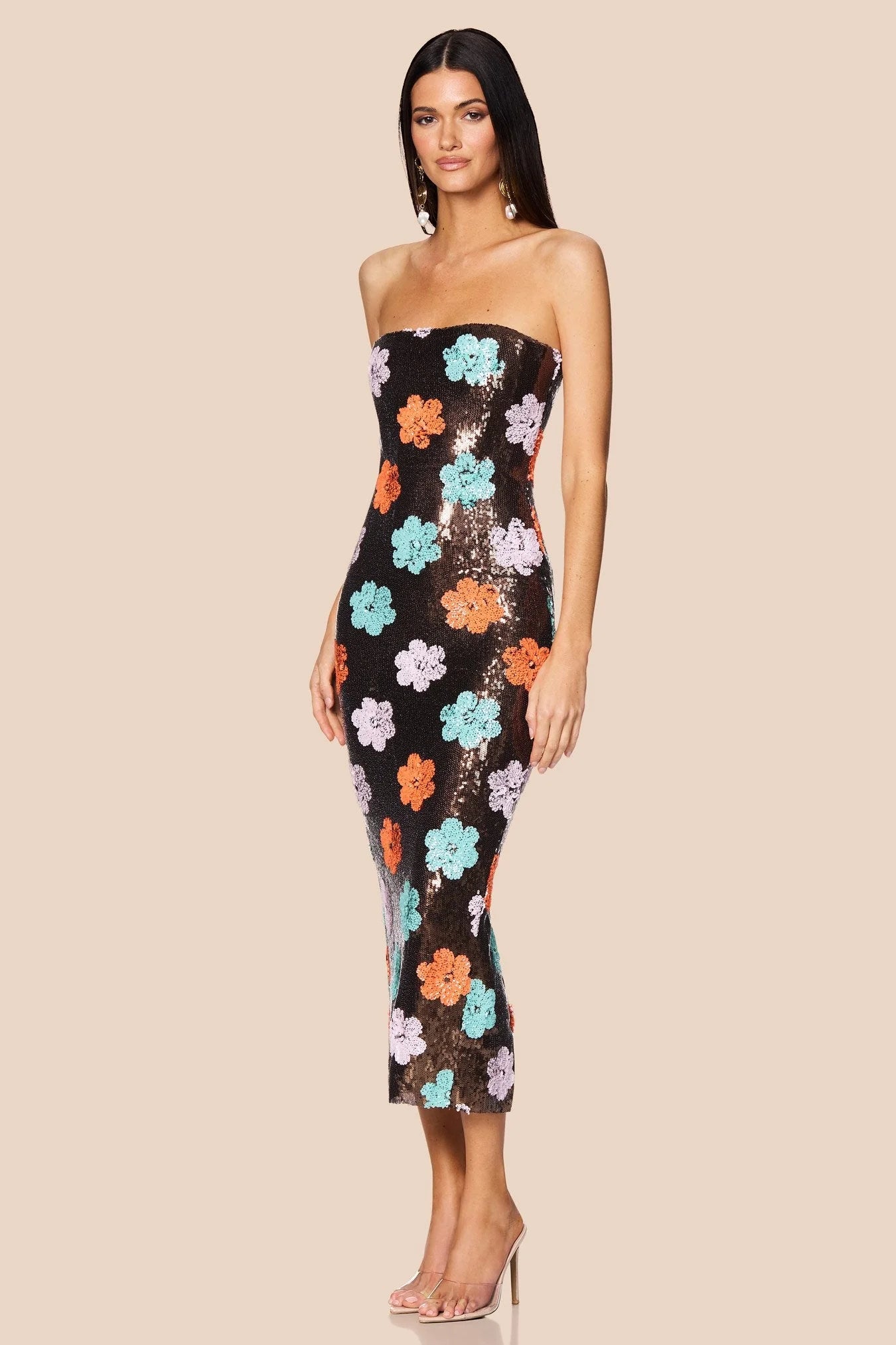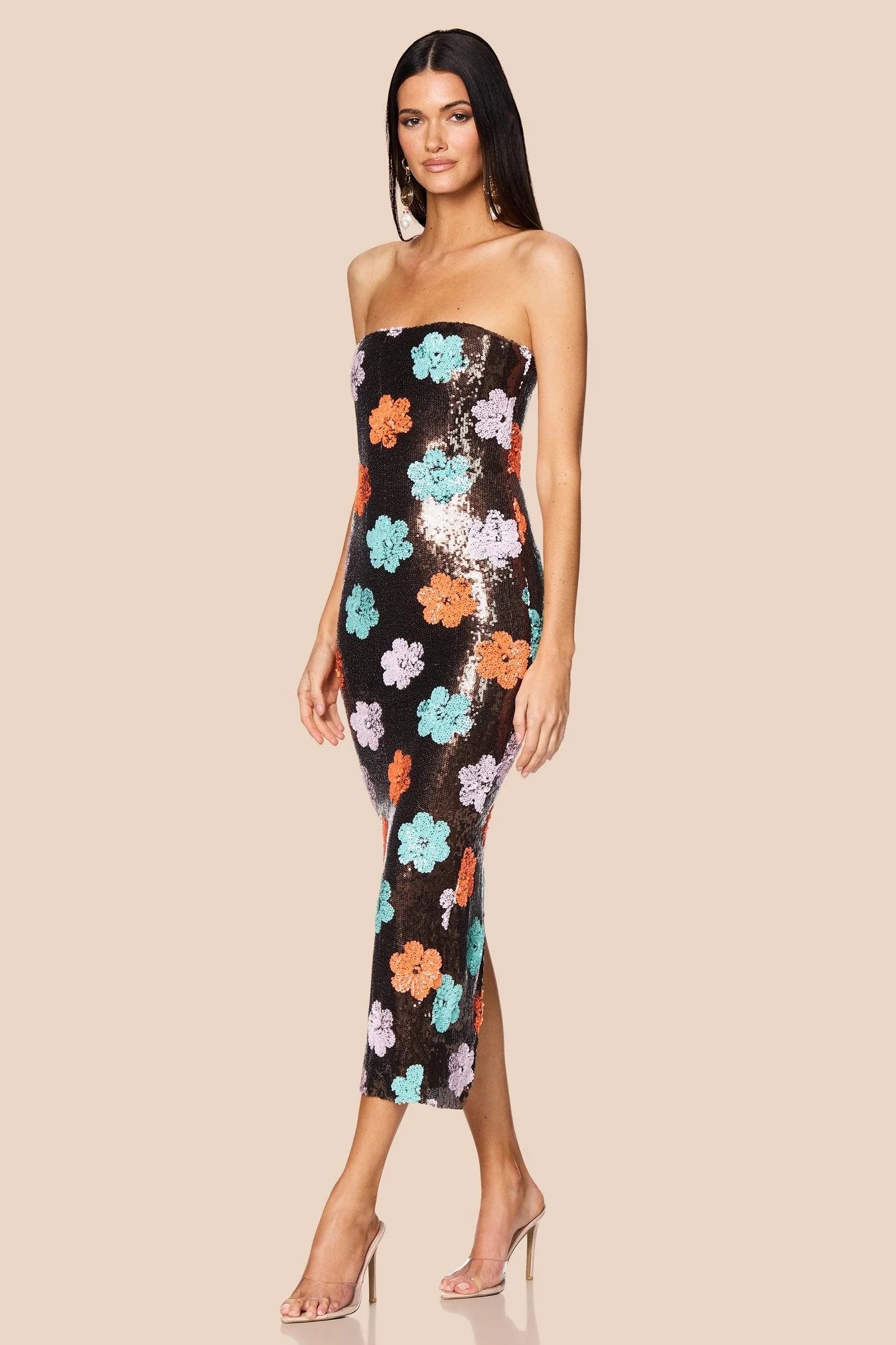 Floral sequin strapless midi dress with structured inner bodice. Crafted in a floral sequin. Invisible zip at back, fully lined.