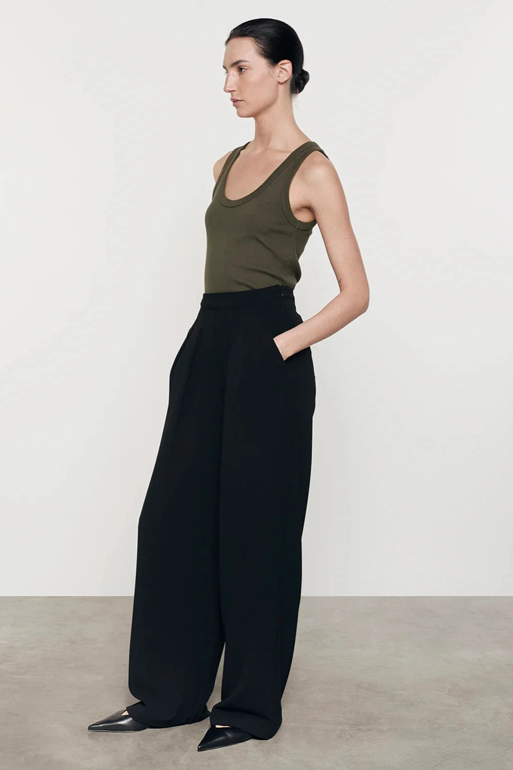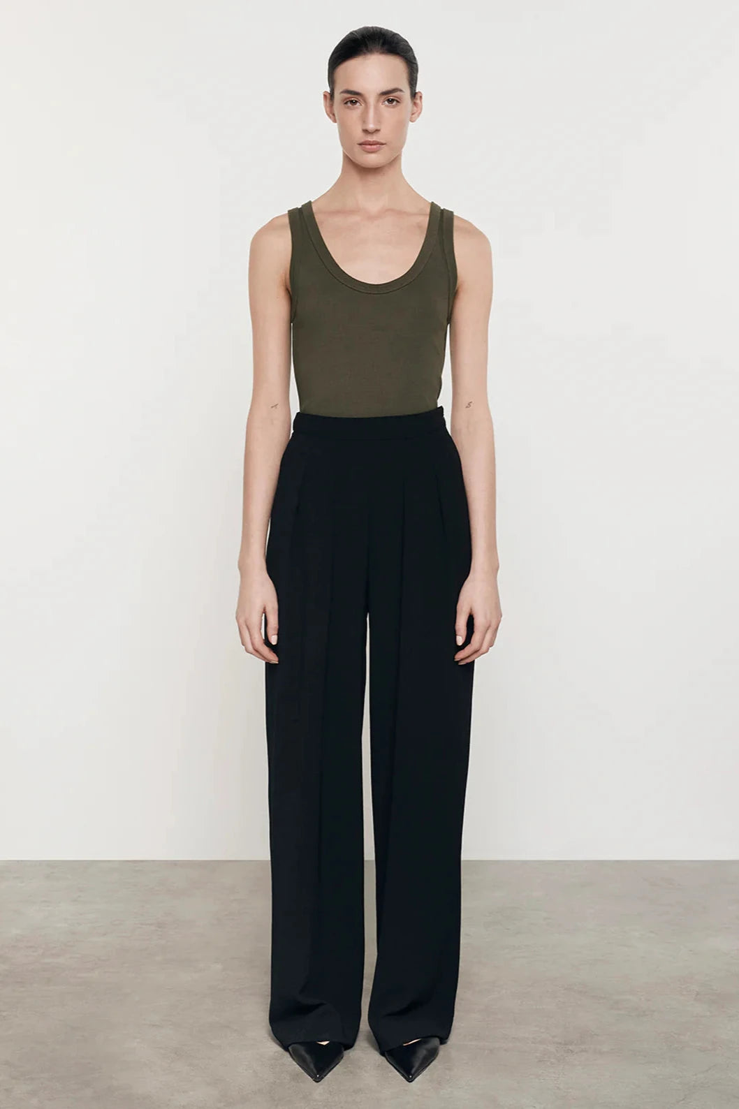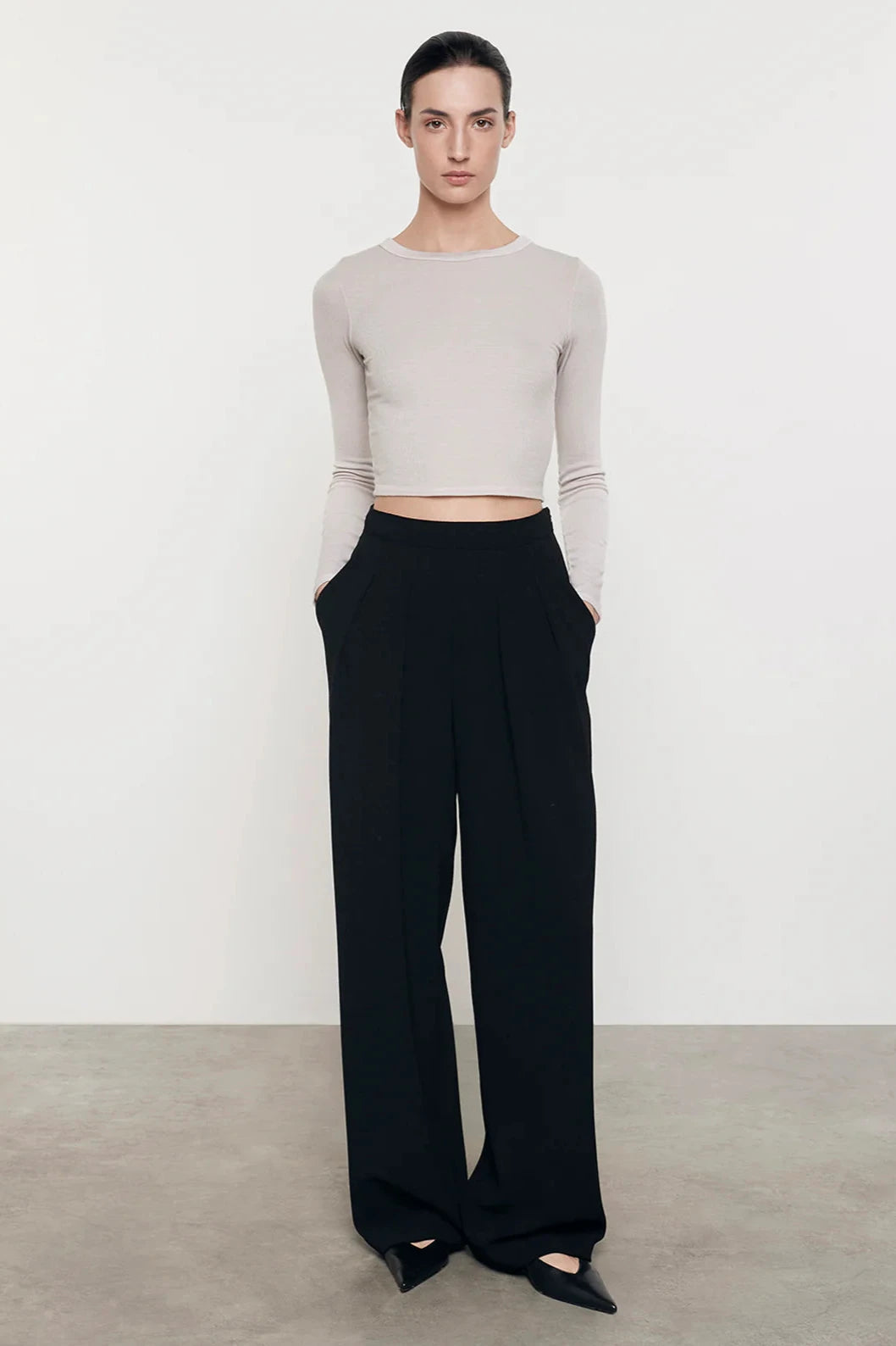 Crafted from the most lightweight and luxurious crepe, the Essential Trouser drapes softly with a wide relaxed leg throughout. Featuring functional side pockets, front pleats, and a side zip closure