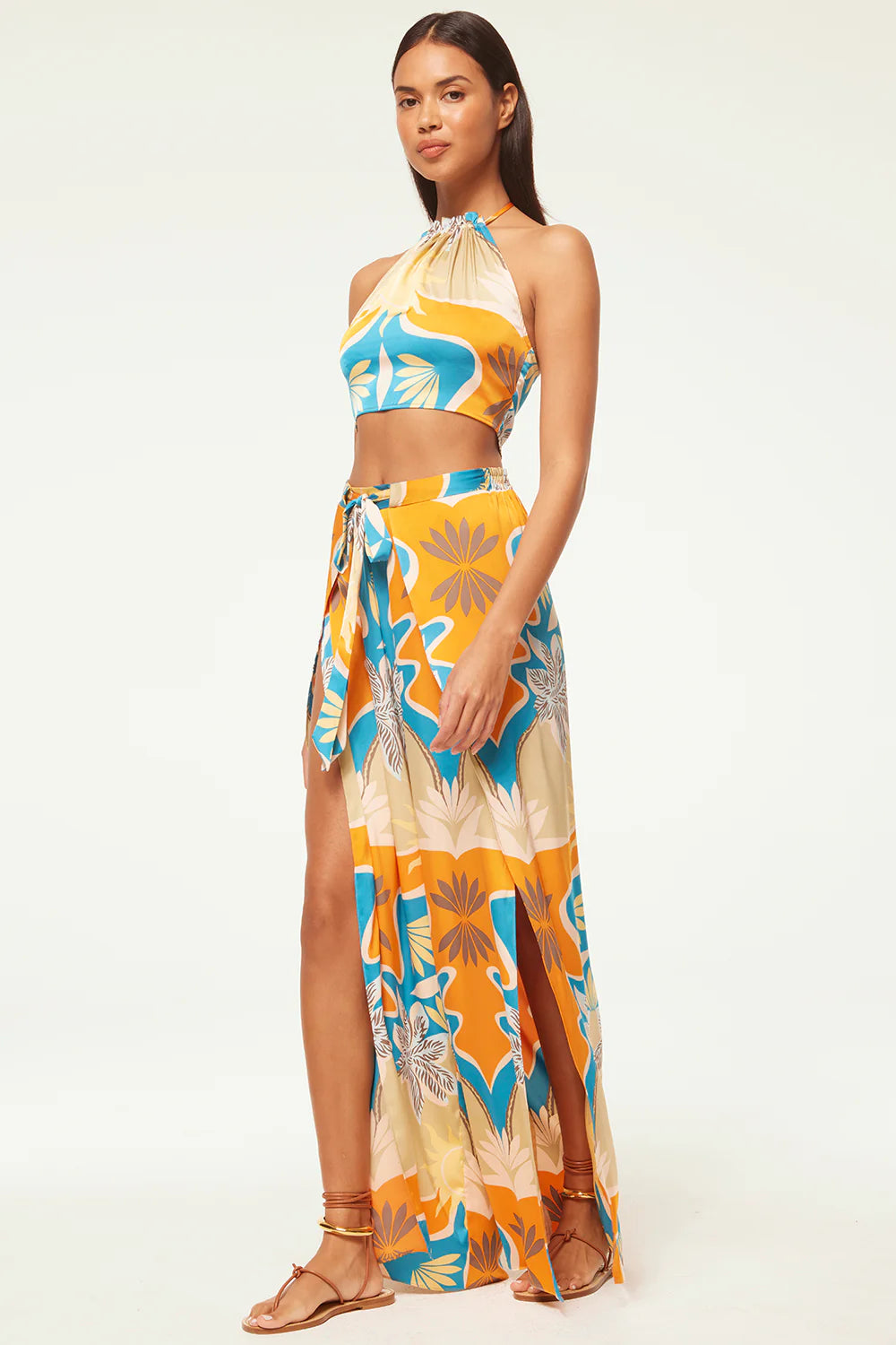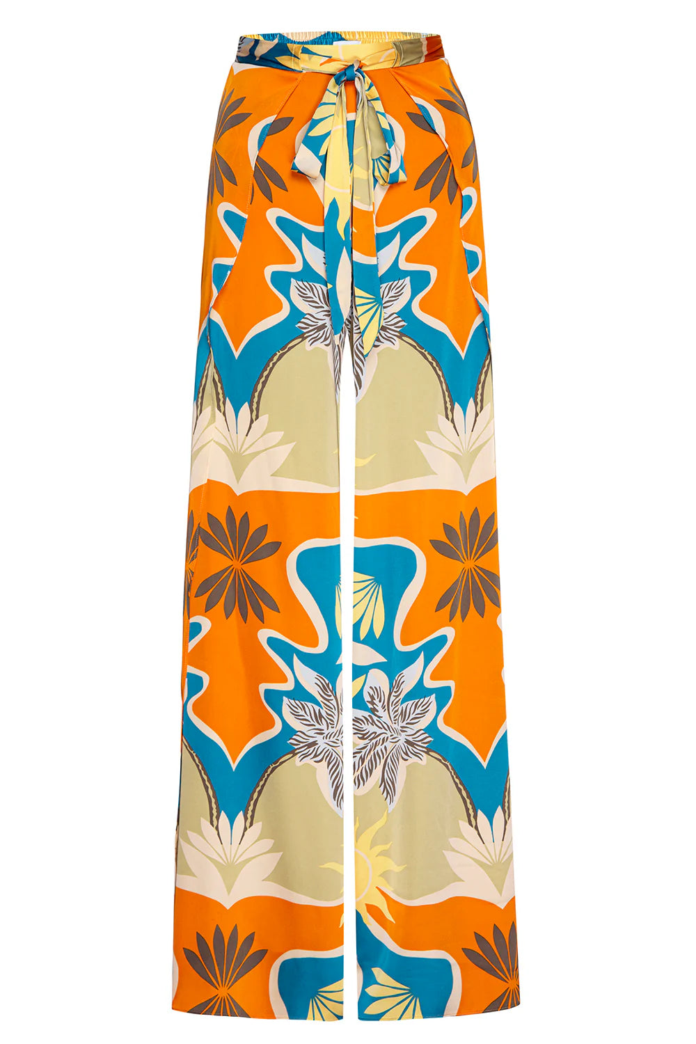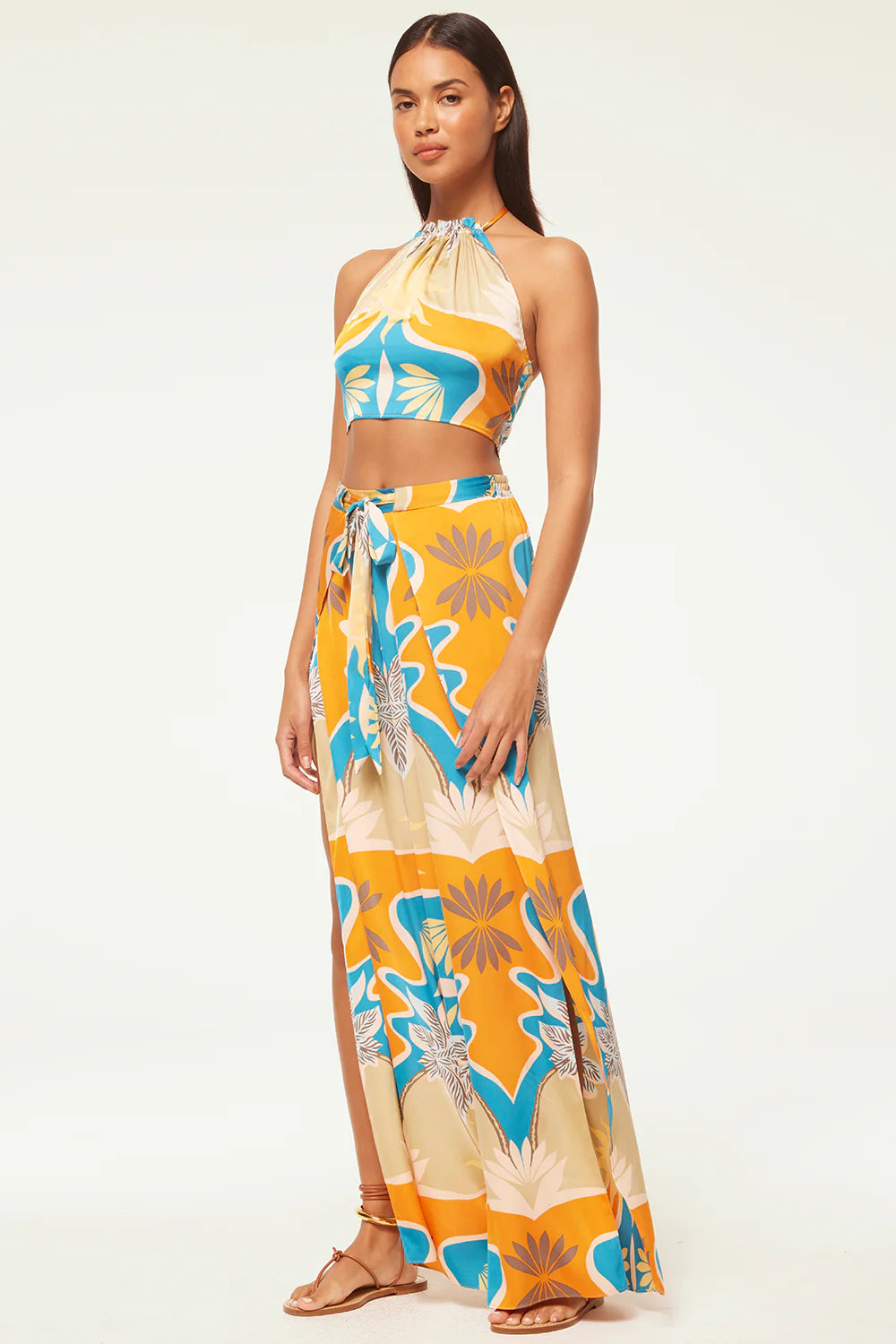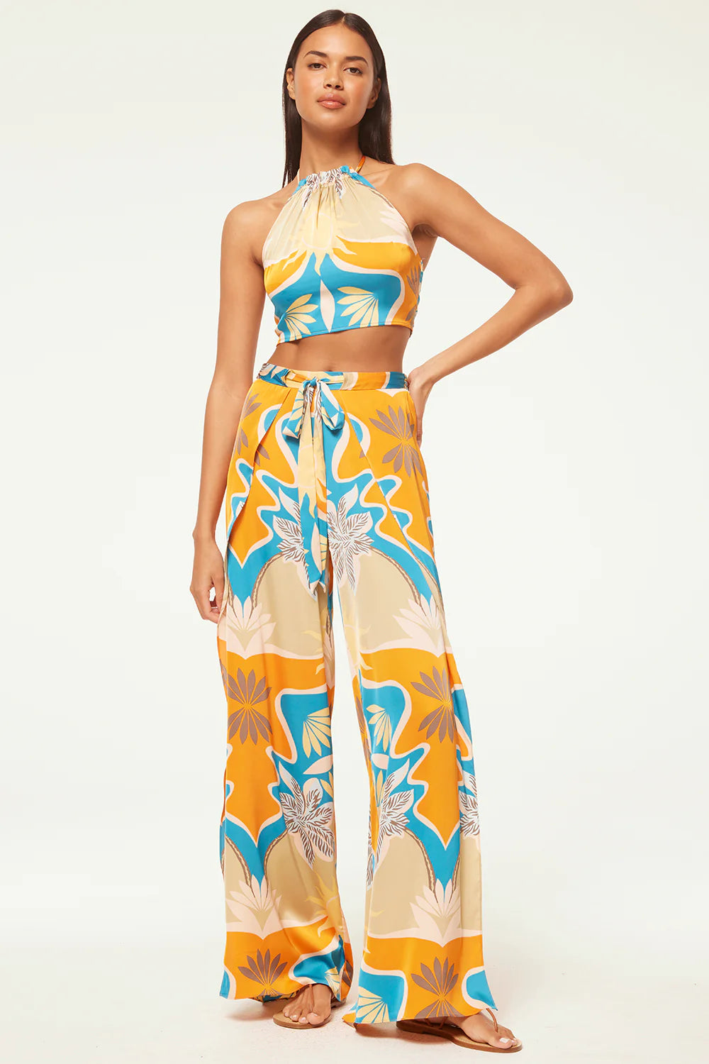 Our new Kanna pant gives a sarong effect with a faux wrap detail and tie waist with a covered elastic back. Cut from a gorgeous Bain De Soleil printed satin, these getaway ready pants feature wide legs with side slit details to the mid thigh. Pair with the coordinating Luan top for the perfect beach to bar look.