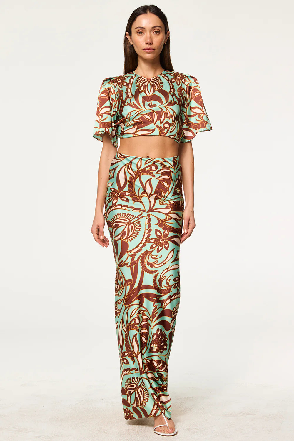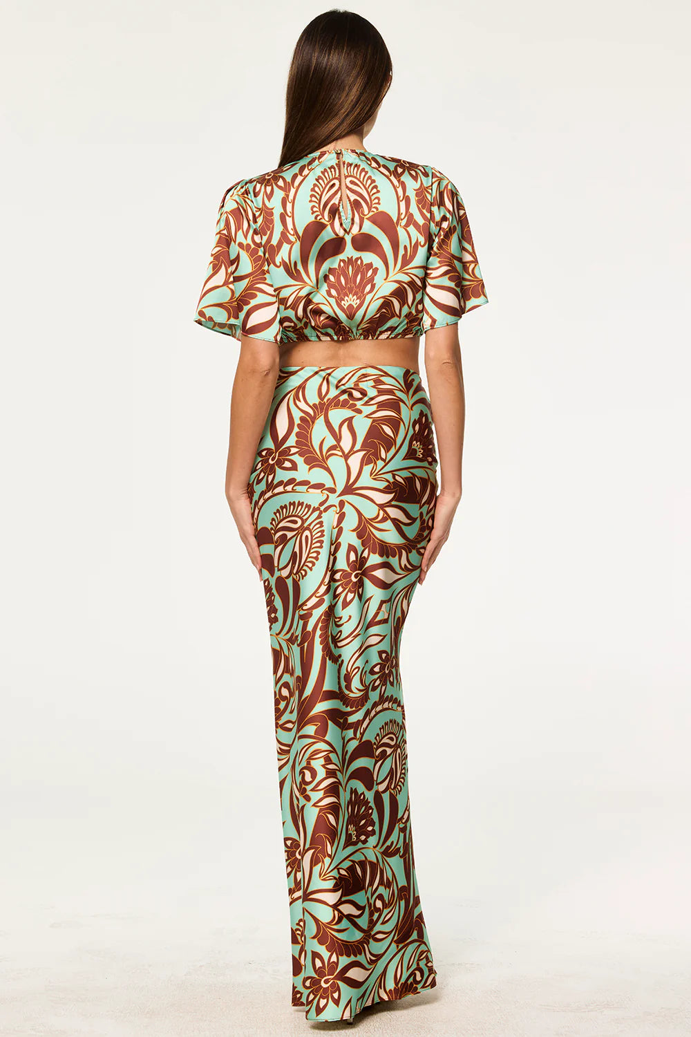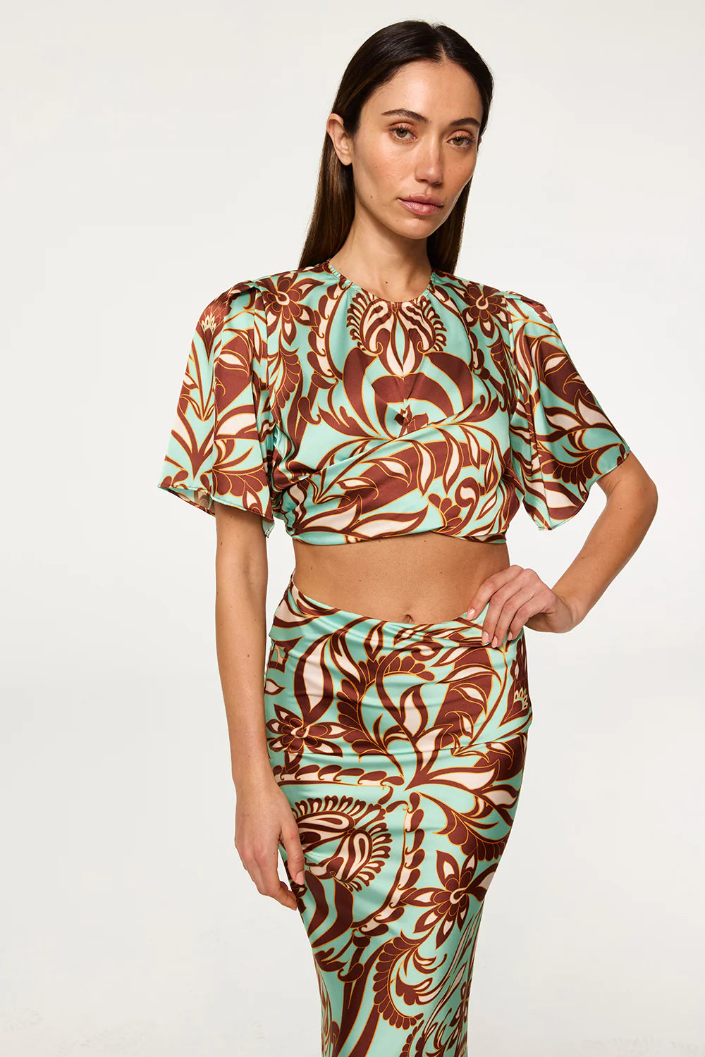 The Roni top is a chic new cropped silhouette cut from our Brown Vintage Botanical printed satin on a striking mint ground. Designed with a high neckline, short wide sleeves, and a flattering twist-front detail, it features an elasticated back and keyhole button closure for a comfortable fit. Pair with the coordinating Sierra skirt for a head-turning summer event look.