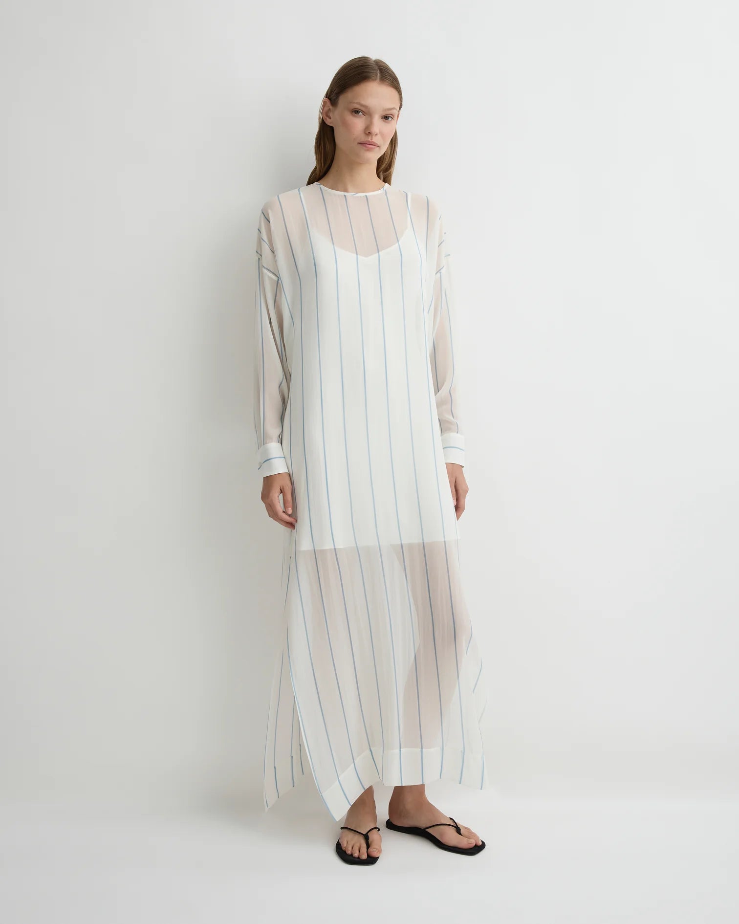 The Capri Silk Tunic Dress in Smoke Stripe is a refined, relaxed silhouette, cut from 100% silk with a soft, fluid drape. Designed with a simple tunic shape, it fastens at the back neck with a delicate button-and-loop closure and is layered over a removable slip with slender adjustable straps. With its relaxed fit and effortless elegance, this piece transitions seamlessly from day to evening.