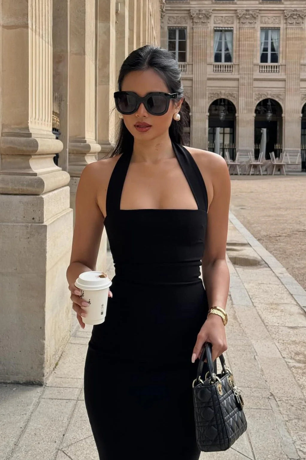 The all-time favourite Nookie neckline paired with a long column skirt and back split. Features wide halter straps and body skimming fit, boning at side bust and an invisible zip at back with rose gold Nookie puller. Fully lined.