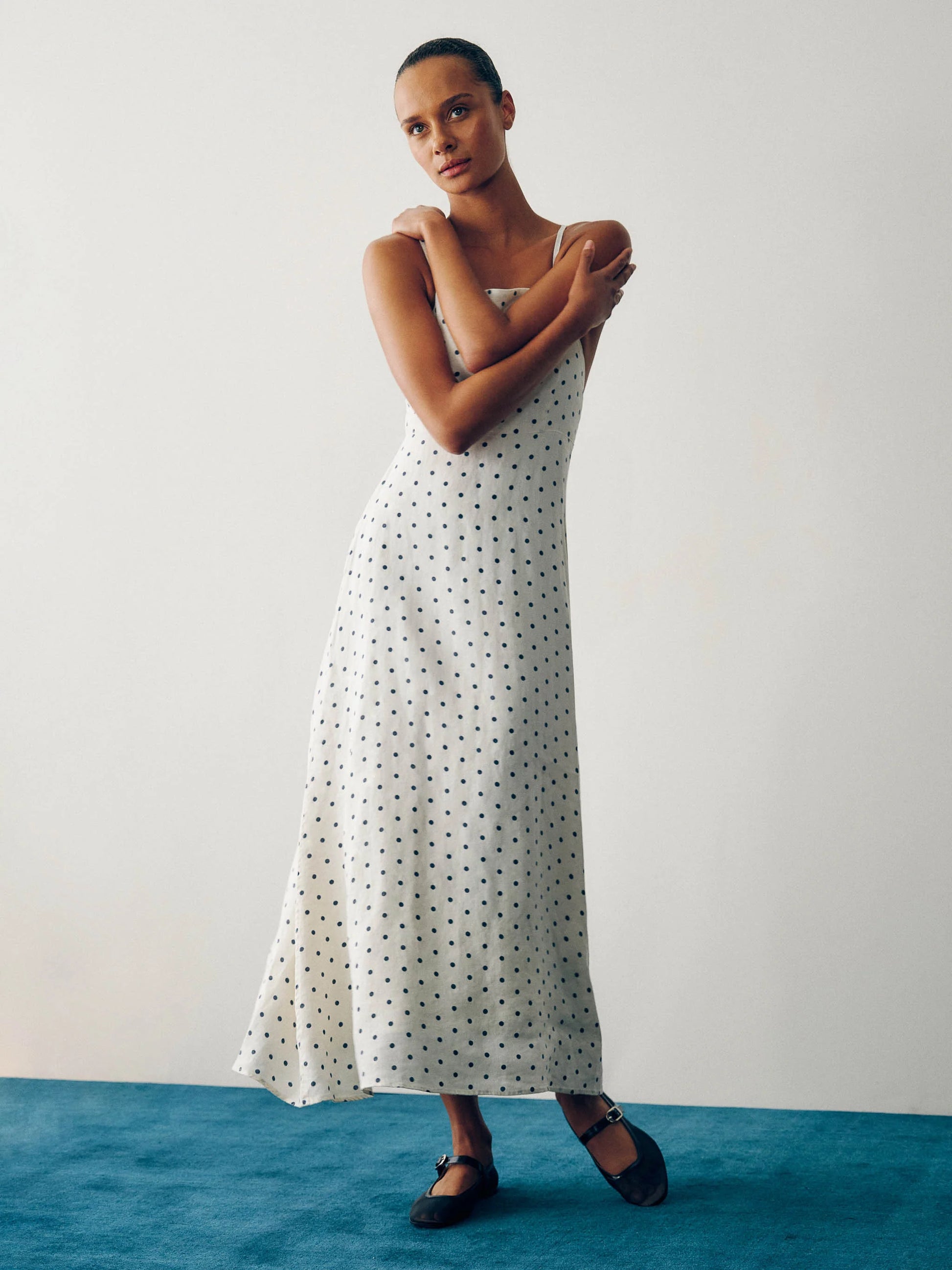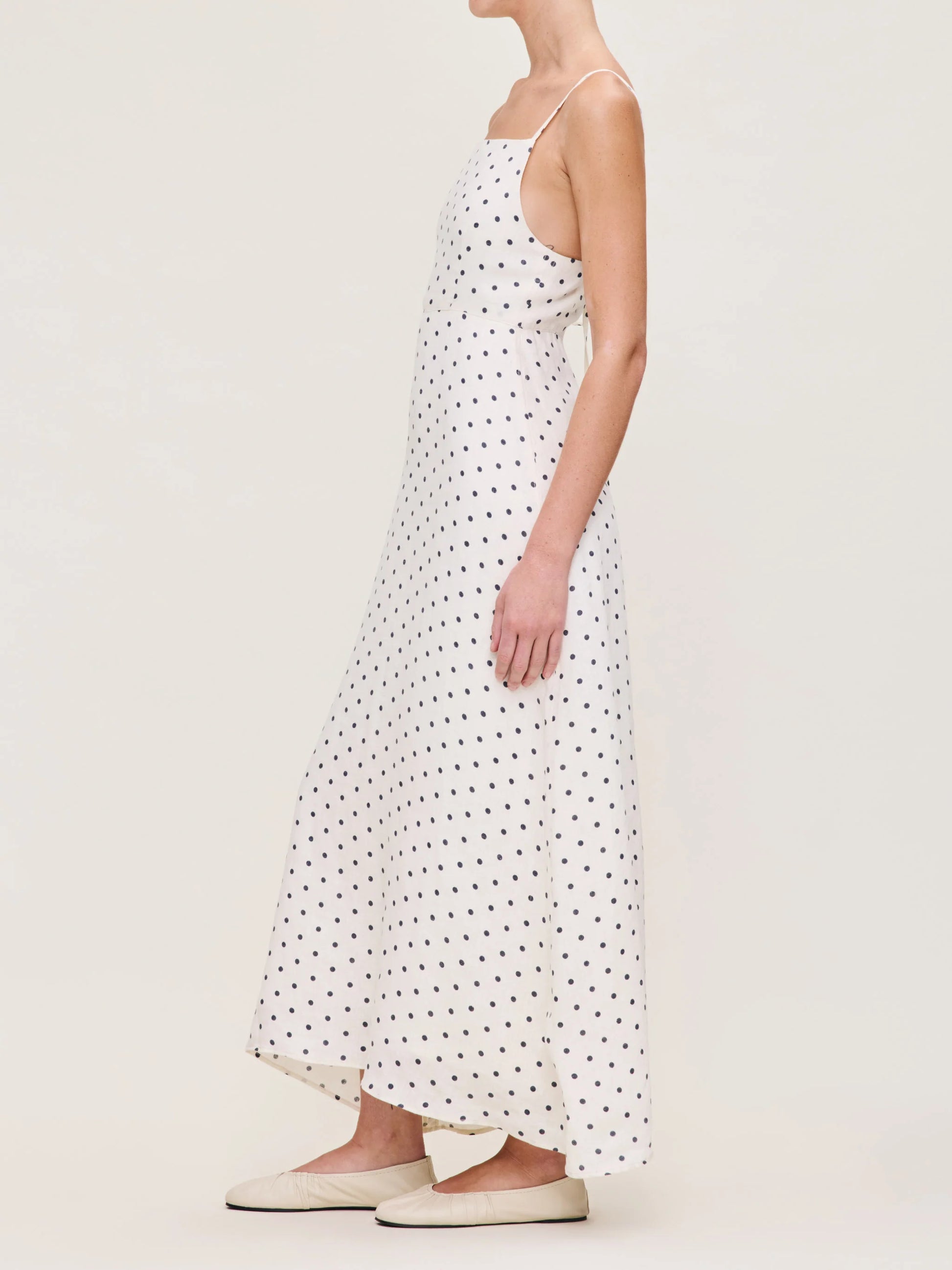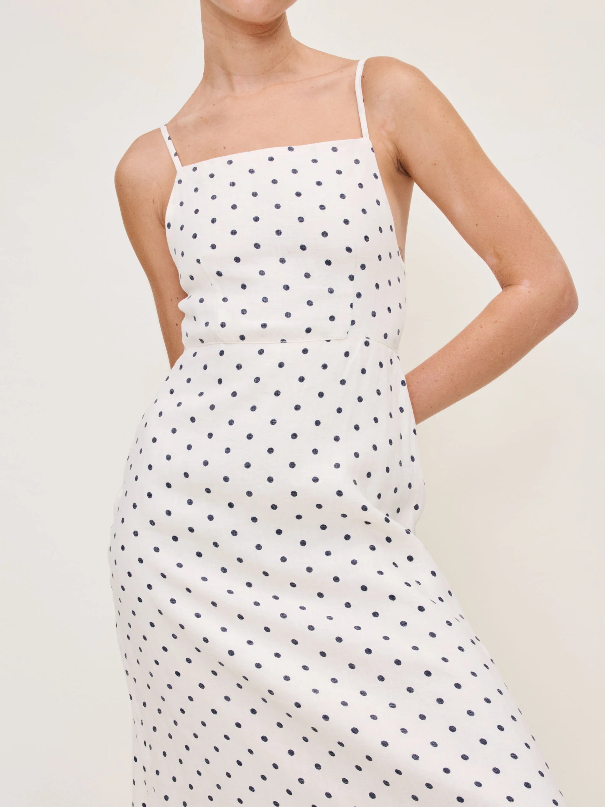 Polka Dots is a navy polka dot printed on soft linen. It features tonal stitching and a clean hem.