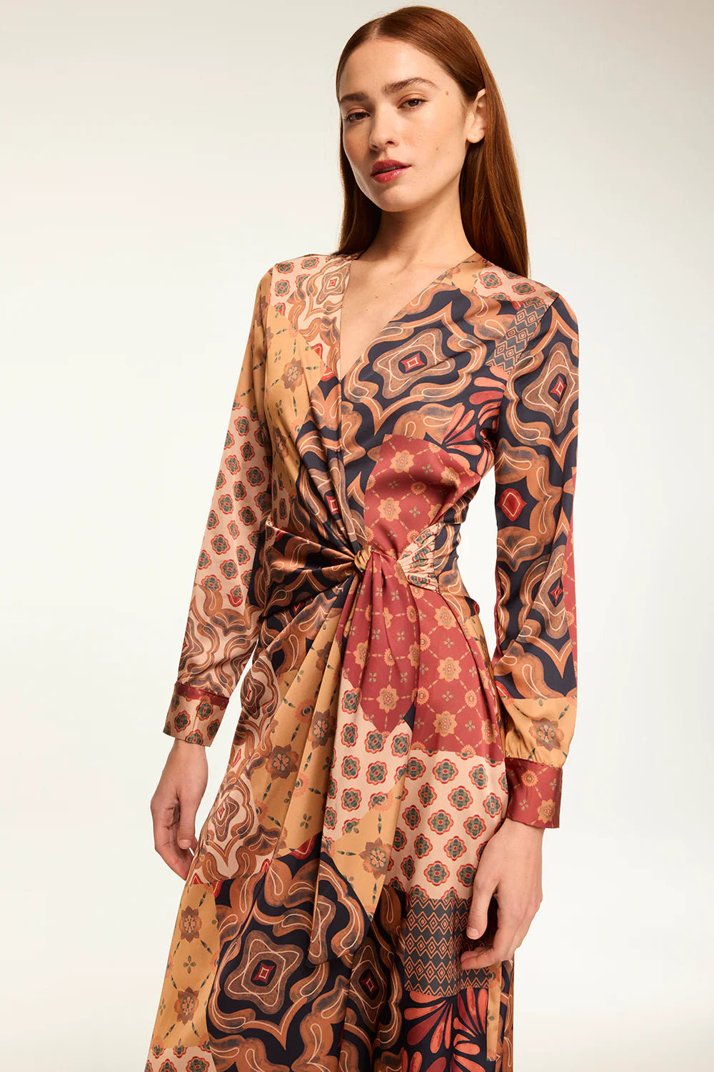Eliza stuns in our fall-ready Surreal Patchwork satin. This chic midi dress is a wrap style with a gathered self-tie waist. A v neckline with long sleeves and button cuffs. Pair with everything from knee high boots to mules.