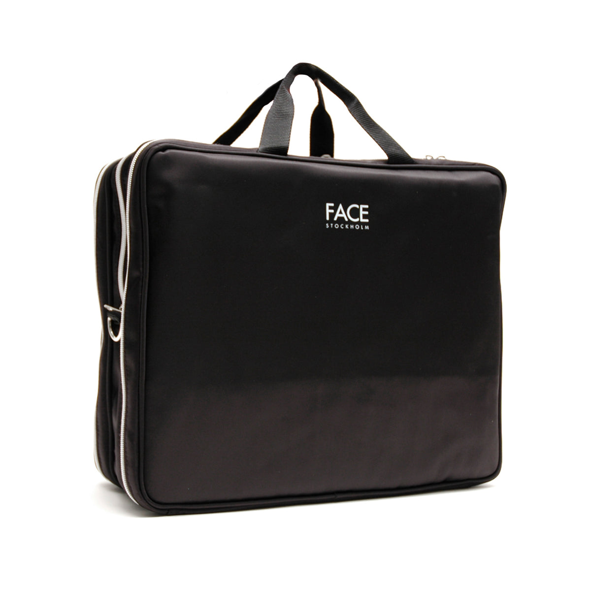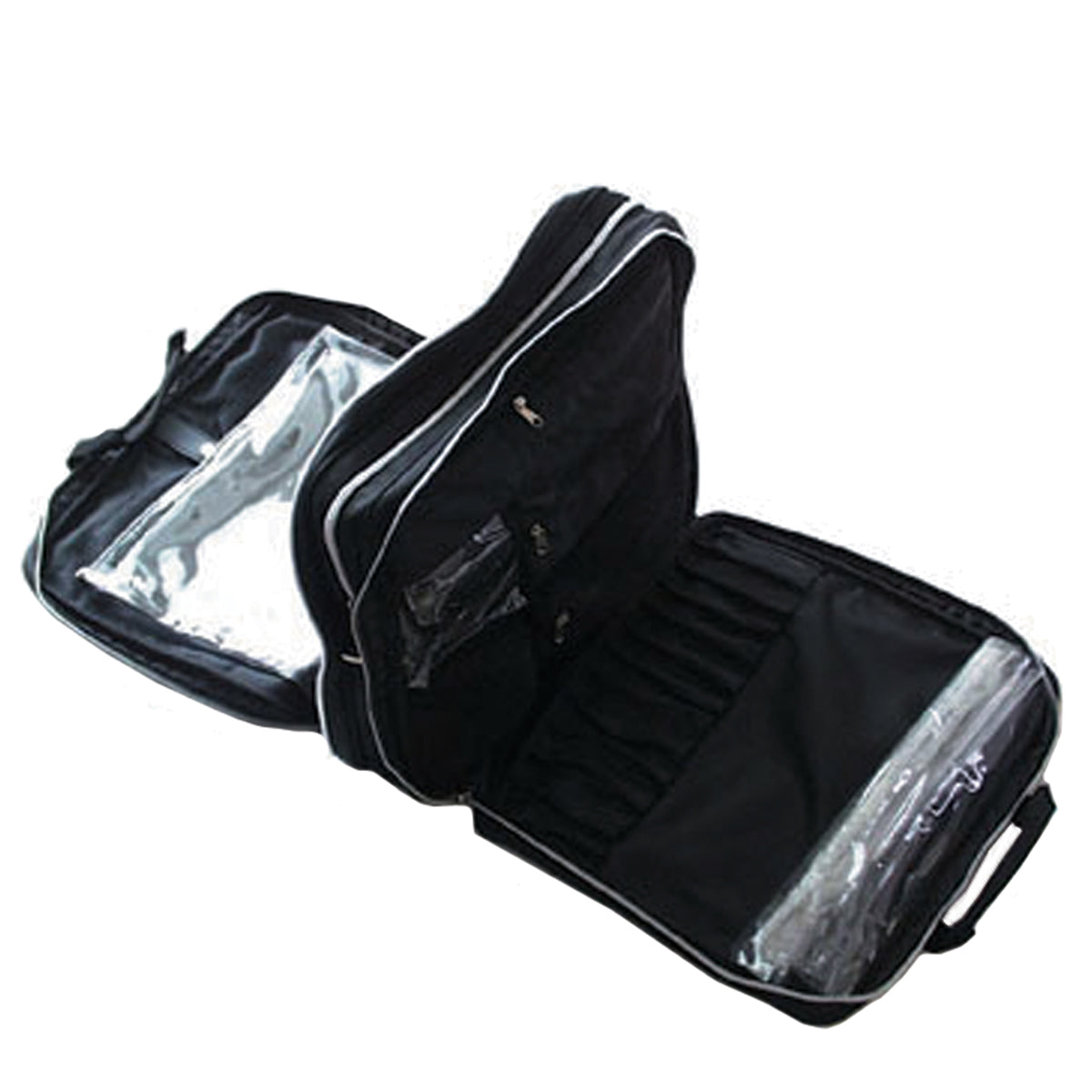 A durable, yet lightweight black rectangular nylon bag with three large zipper sections. Subsections and small zip pockets to organize. Special compartments for brushes, overlapped with plastic to keep flat and protected. Interior plastic zip top section is perfect for skincare. Straps can also be converted to carry the bag as backpack.