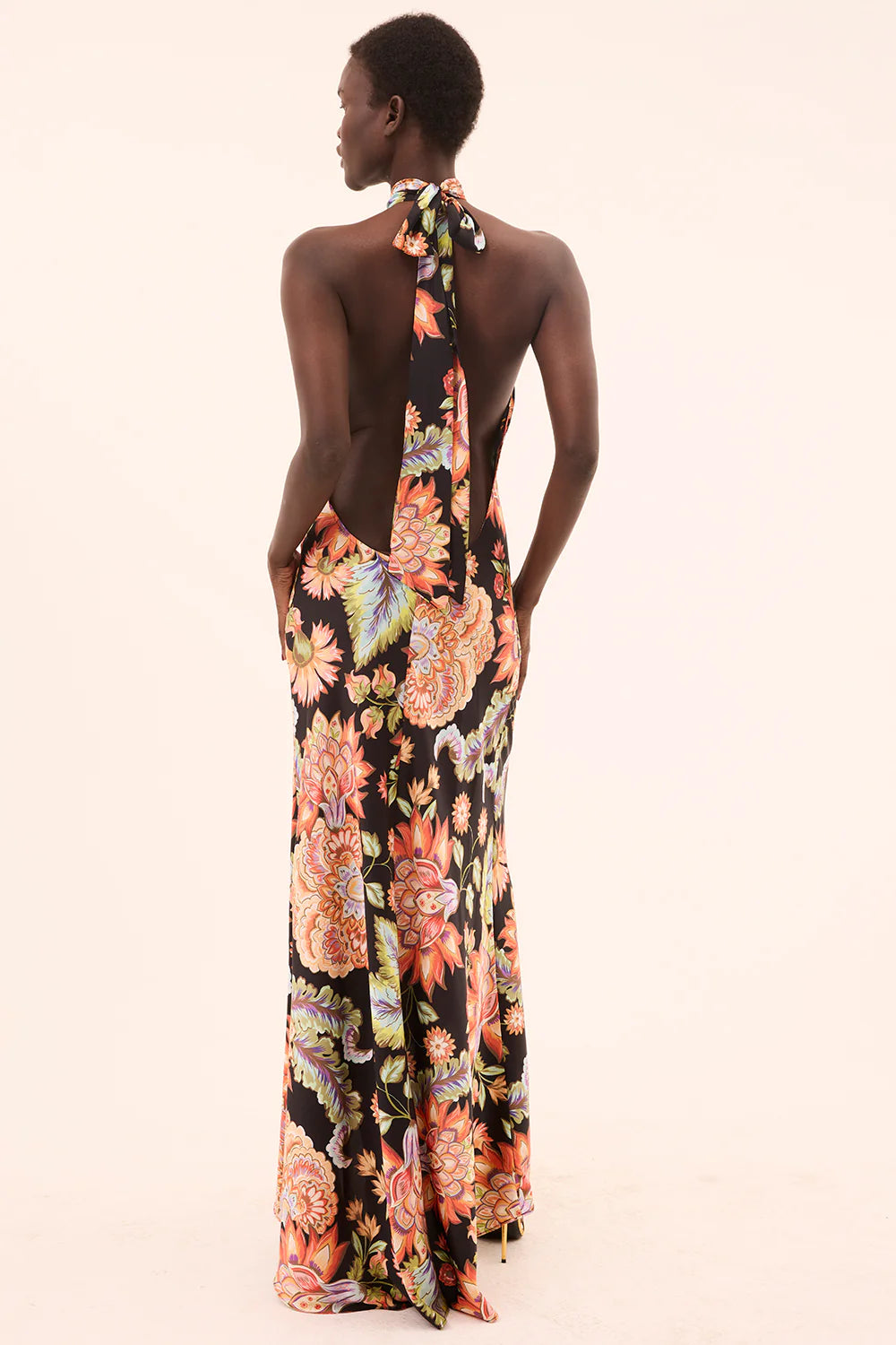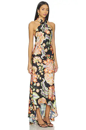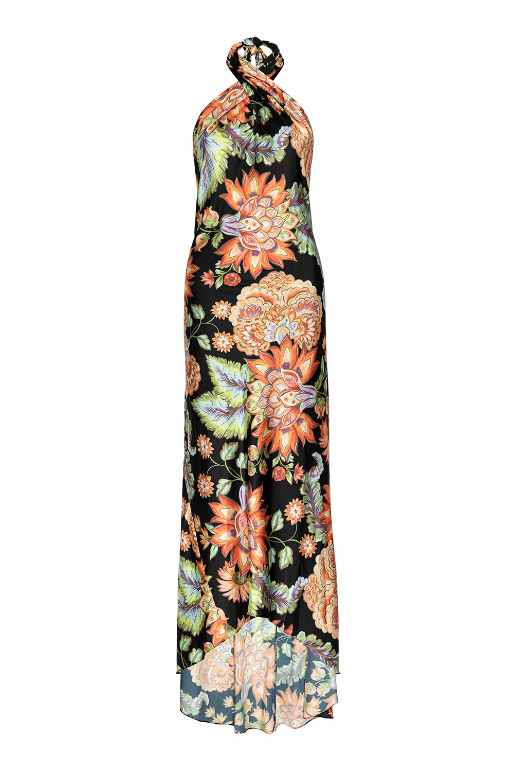 Harley is a stunning, event-ready maxi dress cut from our vibrant Fiery Flora printed satin. This halterneck silhouette features a twist-front bodice with a keyhole detail and a low, open back that ties elegantly at the neck. Finished with a curved, slightly high-low hem for added movement. A dramatic style designed to turn heads this season and beyond.