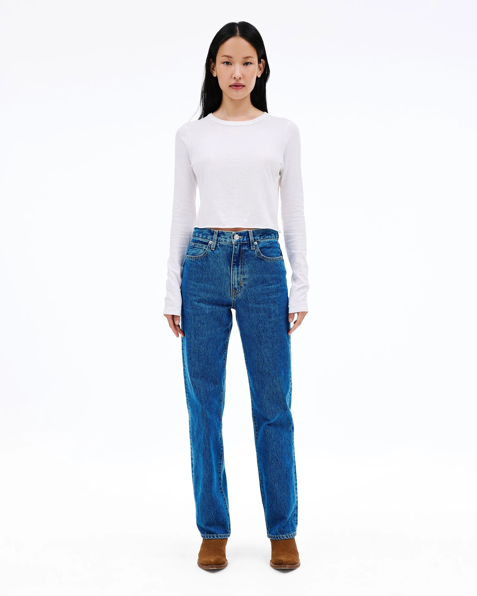 This signature style is designed to fit and flatter the feminine form, visually elongating the leg with a straight leg silhouette and high rise.