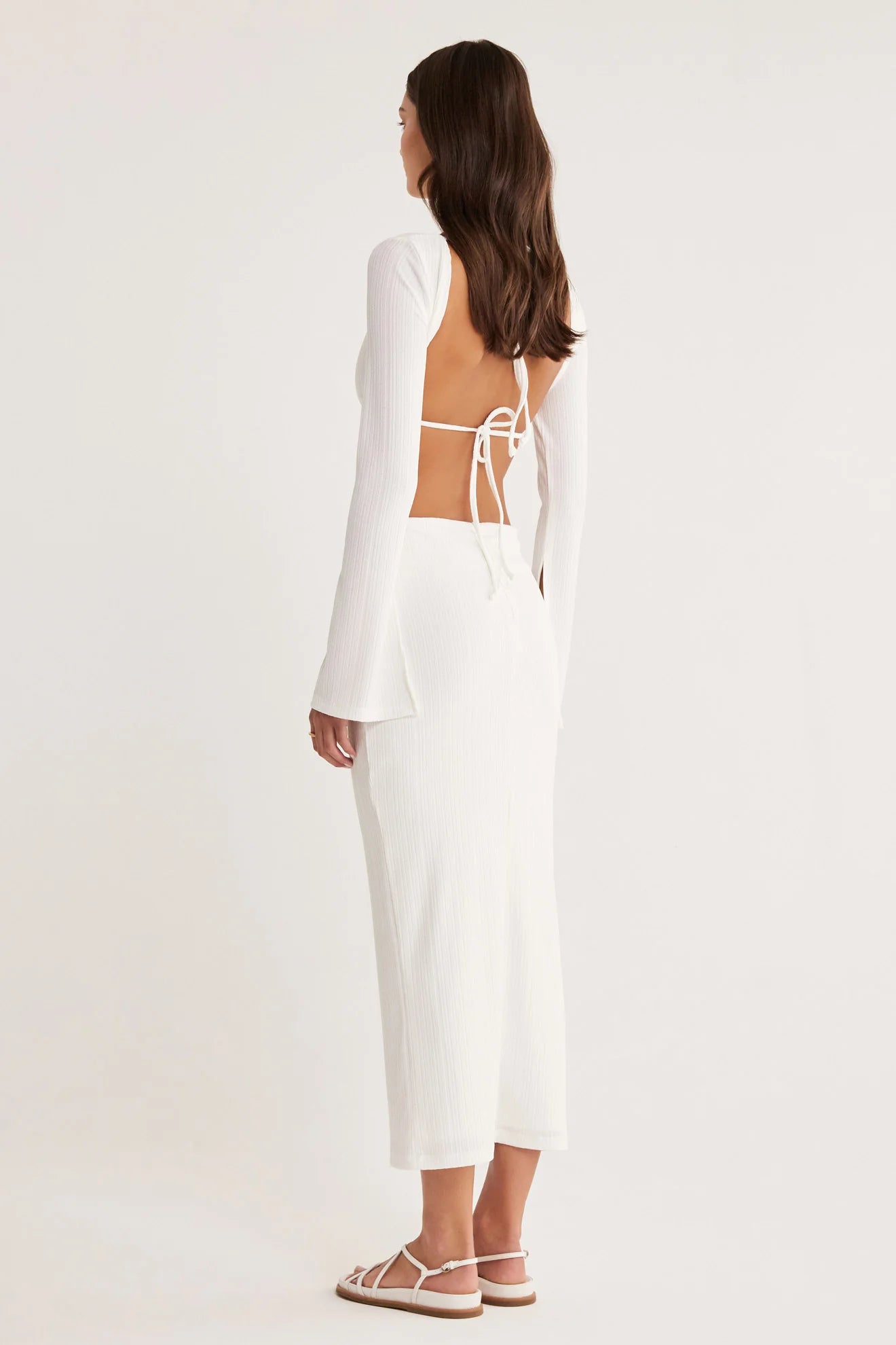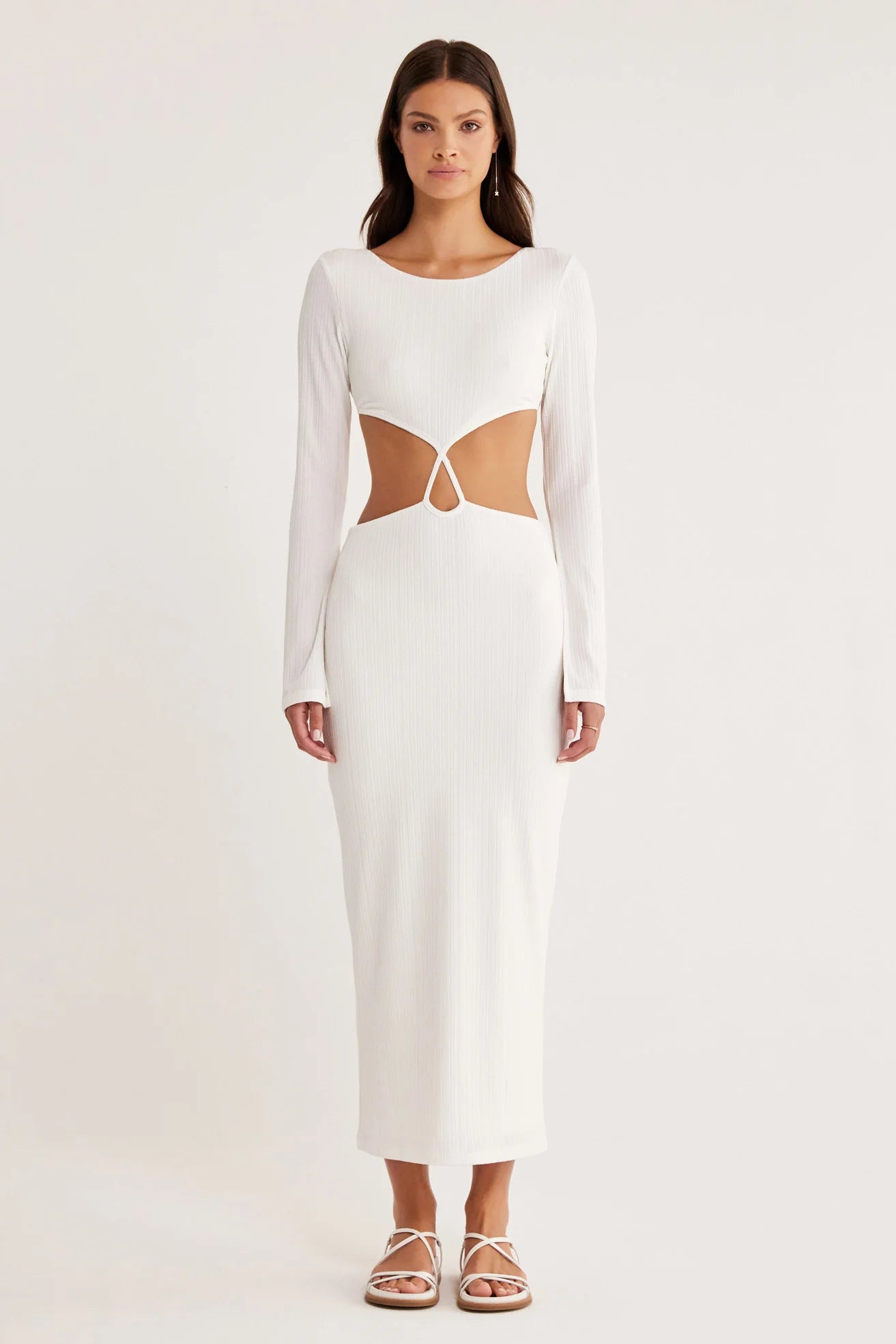 Long sleeve midi dress with cut out at front waist, ties at back and splits at sleeve hem.