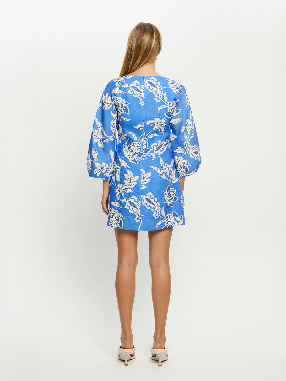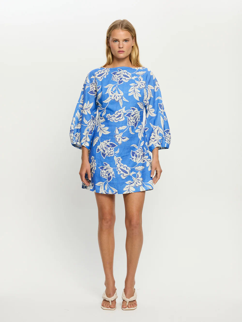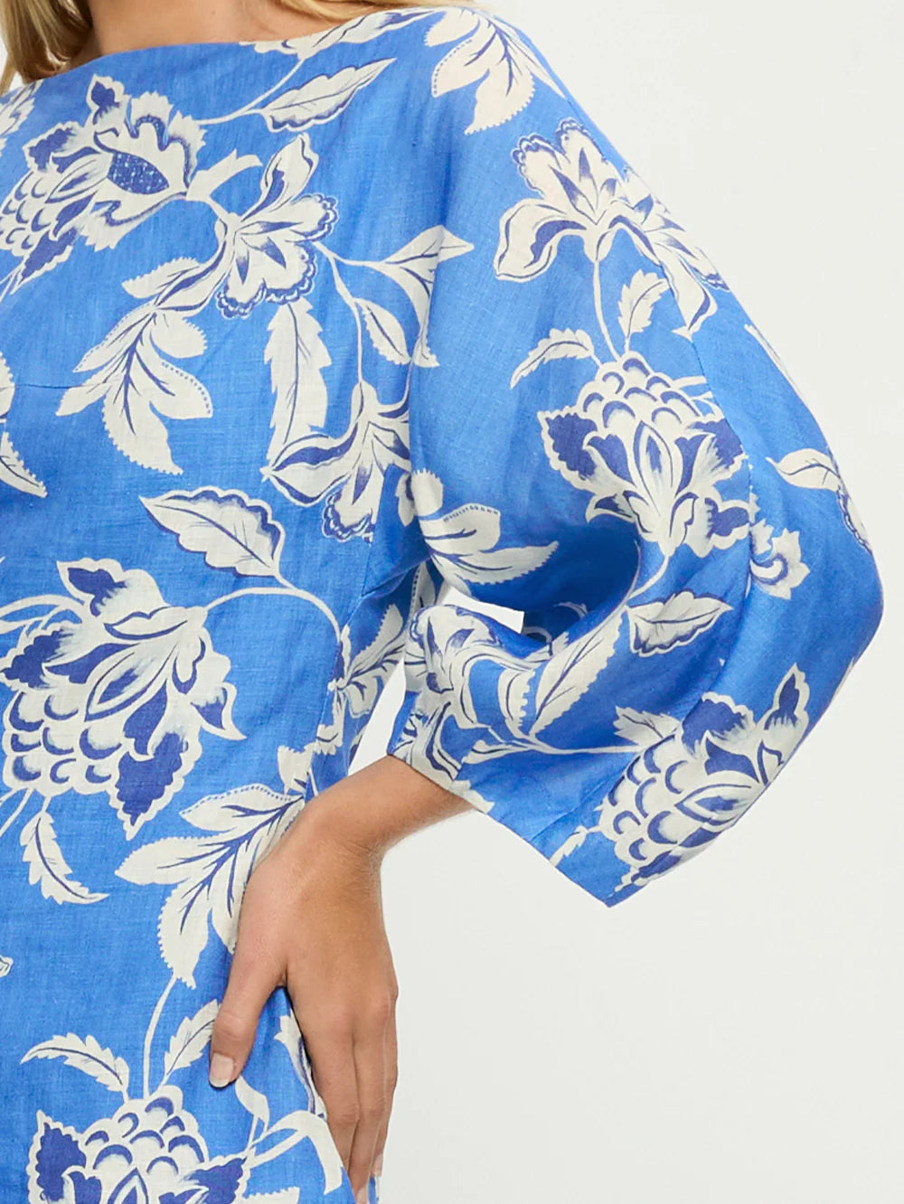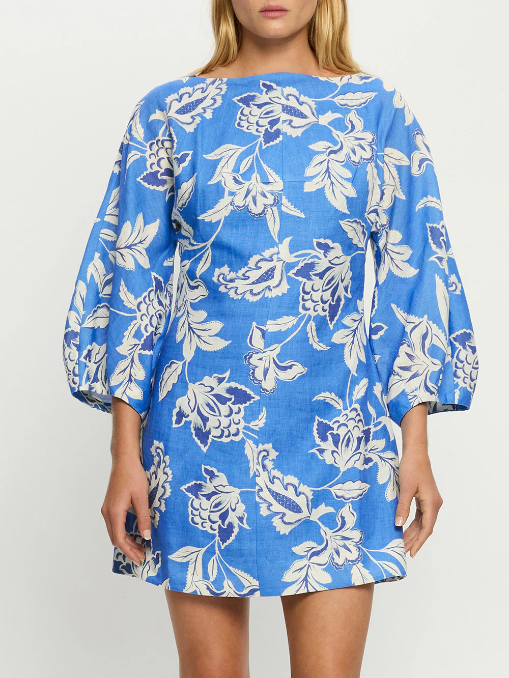 Ren is a vibrant blue print, adorned with crisp white floral motifs that feel both fresh and timeless. The Ren Mini Dress is a modern classic, designed with a soft boat neckline and long sleeves that create an elegant, balanced silhouette. Finished with an invisible zip for a seamless fit, it’s a piece that moves with quiet confidence. Style with heels and statement earrings for elevated moments or for daytime, pair back with sandals and a small bag for an understated, effortless look.