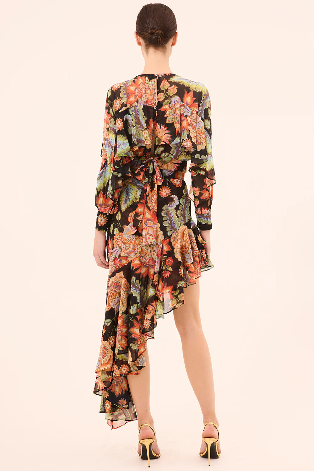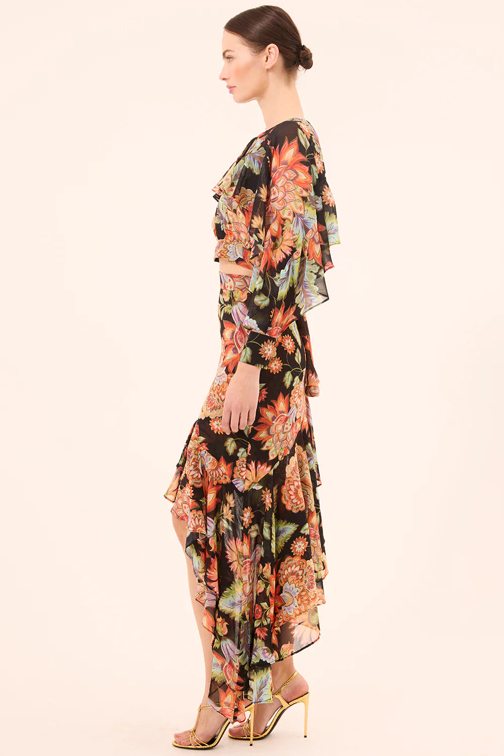 The Sky Skirt is a feminine silhouette with a modern twist. Cut from our striking Fiery Flora chiffon, it features a dramatic asymmetrical double ruffle hem that grazes the ankle and a flattering fit finished with a hidden side zip closure. Pair with the coordinating Silvana top for the perfect party set.