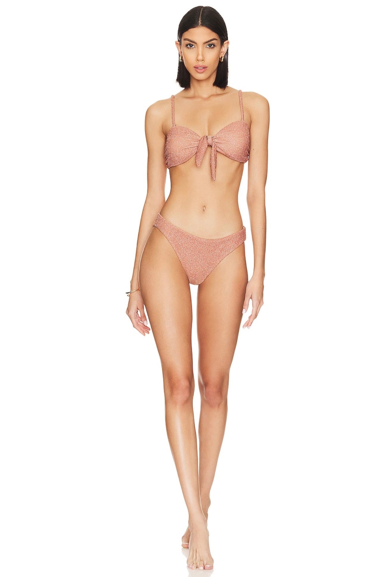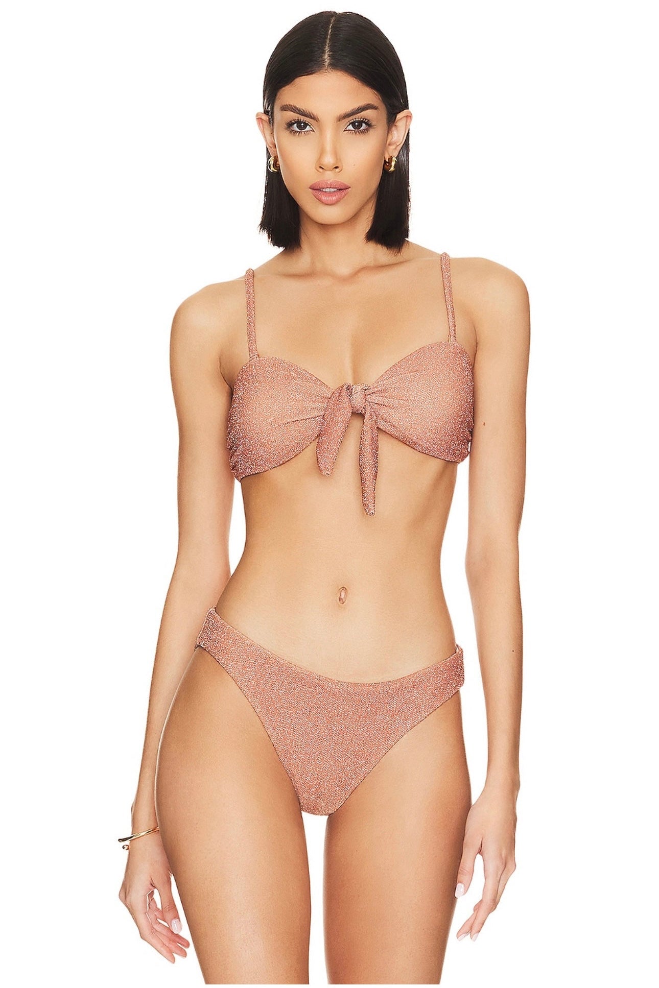 Our best-selling Sophie Top is back and now in our shiny Desert Clay colorblocked fabrication. This top features molded cups and a front tie closure for an adjustable fit. It also comes with removable straps that are also adjustable. Pair this top with the matching Janine Bottom.
