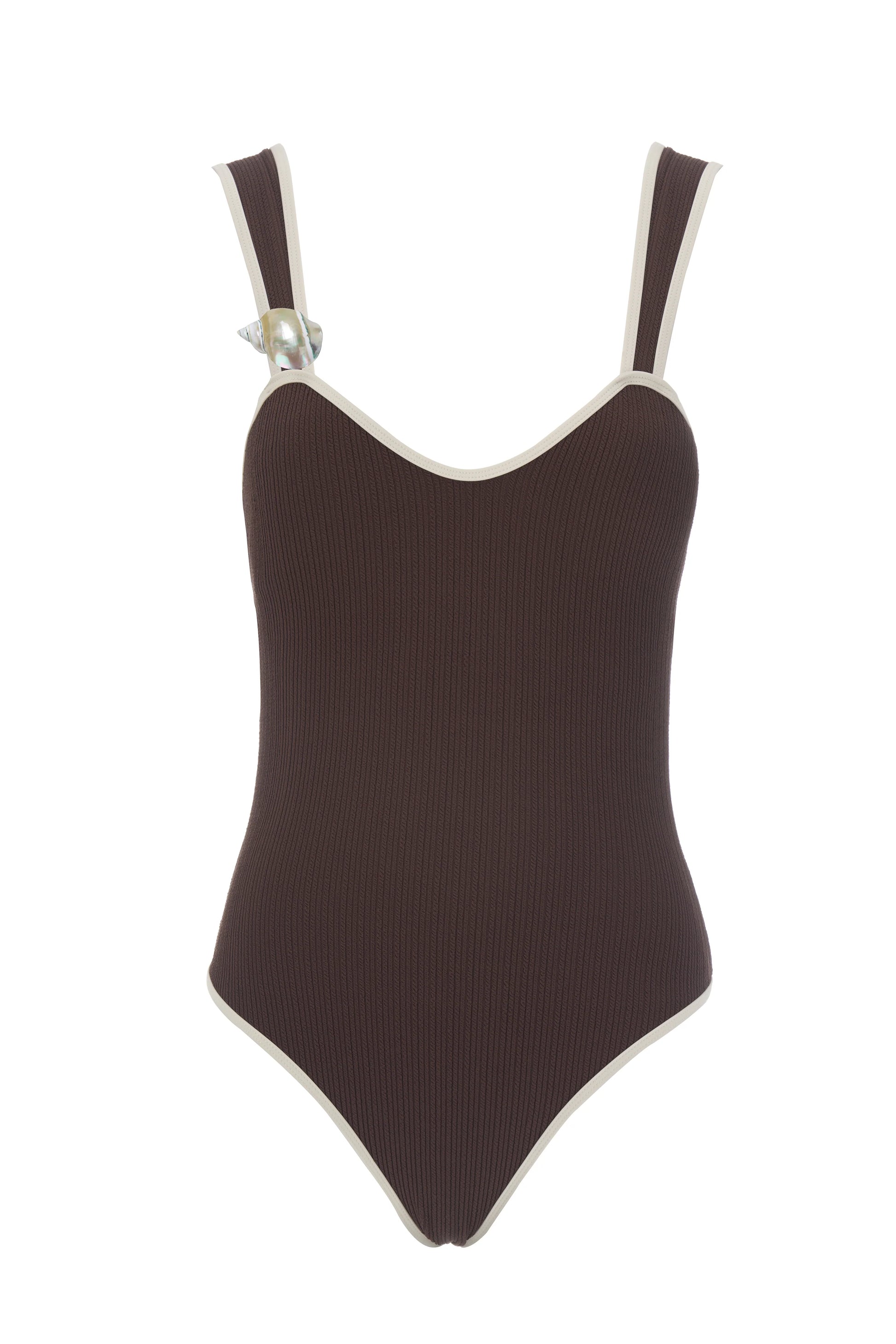 Introducing the Luana, an ode to sun-drenched days and holiday afternoons. The Luana One Piece is a medium coverage swimsuit, designed with a feminine scoop neckline, back tie and contrast bind detail. Fully lined and cut from the highest quality fabrication, this swimsuit will perfectly flatter the body. For centuries, conch shells have been collected as tokens of memory and safe passage. Here, it lends a gentle sense of nostalgia and serene summer ease.