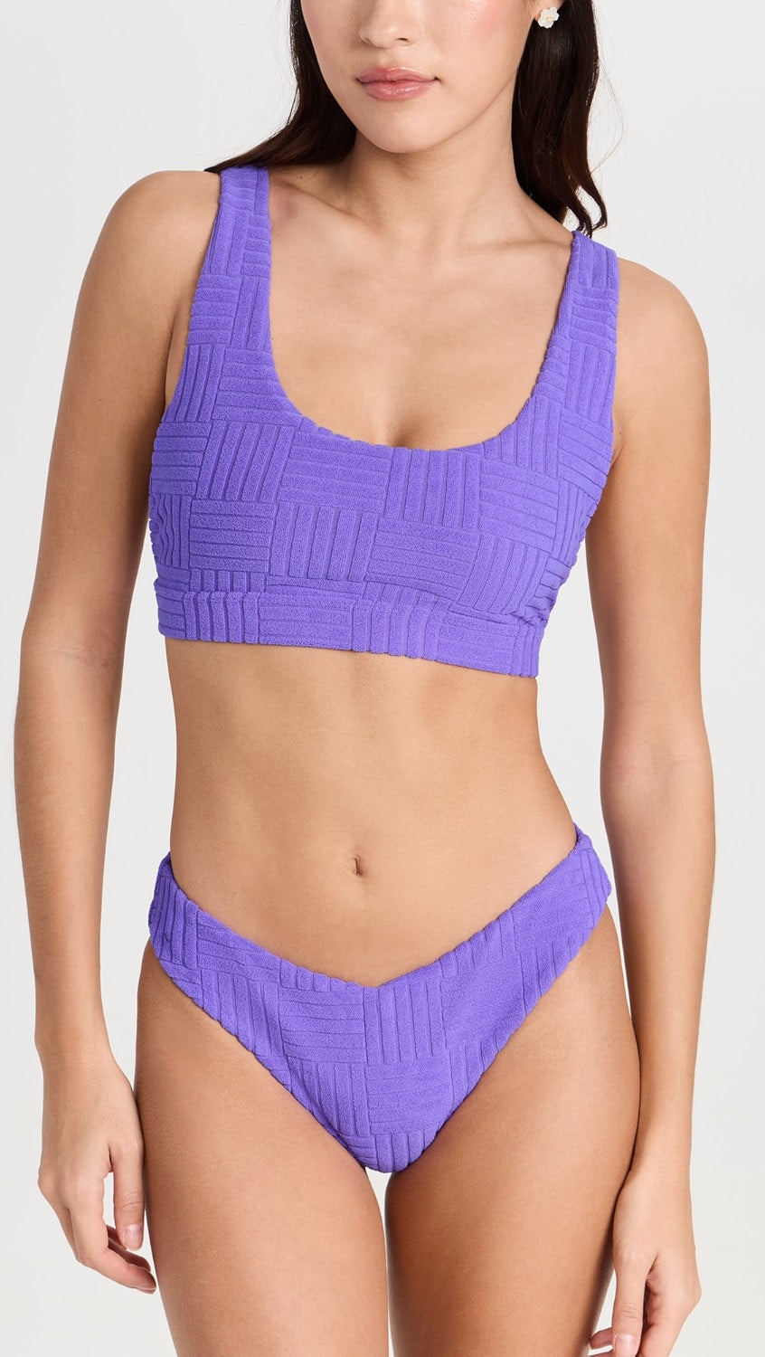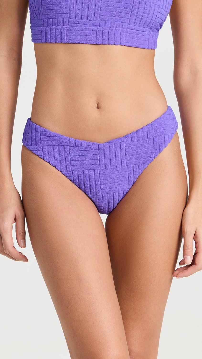 A forever-flattering staple, the Vanessa Bottom features a high-cut leg with dipped-style front and back detail with cheeky bottom coverage. Now in our best-selling towel terry jacquard fabric, this is lightweight, breathable, soft to the touch, and anti-pill. Pair these bottoms with the matching Peyton Top in Ultra Violet.